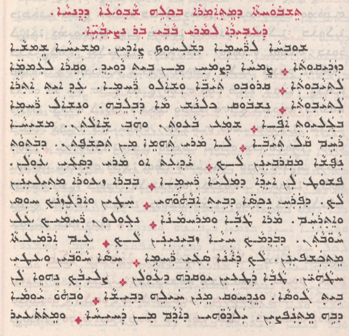 ശുവ്ഹാ ല്റഹ്മേ ദ്ശൽഹൂക് സേദയ്ൻ മ്ശീഹാ ശെംശാ ദ്സന്ദീക്കൂസാ. സെമ്ഹാ ദസ്മഹ് മിൻ ബേസ് ദാവീദ്. വക്റാ ല്അമ്മേ ലസ്യാവൂസാ. ഖ്റോവു തയ്യാവേ വശ്അൽ റഹ്.മേ. അദ് ഈസ് അസ്.റാ ലസ്യാവൂസാ. നെശ്.വോഖ് കോൽനാശ് മാ ദവ്.ലെമ്പേ. ഉനെശ്അൽ റഹ്.മേ ബ്ഗല്.യൂസ് അപ്പേ. ശ്മാ ബാവൂസൻ ഉഹവ് ശേലാസൻ മ്ശീഹാ റാഹേം ഖാൽ തയ്യാവേ. ലാ മാർ തഹ്.മേ മിൻ തഹ്ശവ്സൻ. ദ്.വസ്.വാസ് നവ്ശാ മ്ഖർവീനൻ ലാക്. യാദ്അത്ത് മാർ ദ്സങ്കീ ആവൂലൻ. പ്ശോഥ് ലൻ ഈദാ ദ്മല്.യാ റഹ്.മേ. വവ്റാ സ്വോറാ മ്സീലീനൻ ലാക്. ദ്പറഹ് നെഹ്സേ ദ്ബേസ് ആവാഹാവ്. ഹ്ത്തയ്ൻ വറ്ഗെസ്നാക് ഹൂസ് വെസ്.റാഹം. മാറാ ഥാവാ വമ്റഹ്.മാനാ. ന്ഗൂലൂൻ റഹ്.മയ്ക് അൽ യാവ്ബാസൻ. ദ്.വദ്മാക് ഹയ്യാ സ്.വീനീനൻ ലാക്. വം അറ്മല്ത്താ മെസ്കശ്പീനൻ. ലാക് ദയ്നാ സങ്കീ റഹ്.മേ. ഹസ്സാ ഹവ്ബയ്ൻ വഥീ ഹഥാഹയ്ൻ. ഥാവാ ദഥീൻ യുഖ്റേ ദ്ആവൂലൻ. സ്ലീവാക് നെഹ്.വേ ലൻ ബേസ് ഗാവ്സാ. ഉനെദ്ഹോഖ് മെന്നൻ ഹയ്ലേ ദ് വീശാ. വവ്ഹാവ് യാവ്മാ ദ് വേ മെസ്നപ്സീൻ. യൽദാവ് ദ്ആദാം മിൻ ദഹീഹാ. ഉമെത്തീർ കോൽനാശ് മിൻ ദമ്കൂസാ. ദ്മായോസൂസാ ല്മെശ്താലു. ബ്ഹാവ് ബേസ് ദീനാ ദ്.വേ മെസ്പറീൻ. ഥാവേ ഉവീശേ അക്മാ ദസ്അർ. ഹന്നാനാഹ് നെഹ്.വേ സ്നെഗ്റാ ഹ്.ലാപയ്ൻ ഉലാ നെസ്ഹയ്യവ് ബ്റീനാഹ് കേനാ. വവ്ഹായ് ദ് ദാൻഹീൻ റഹ്.മയ്ക്ക്. നെപോക് ലുറ്ആക് അക് സെവ്.യാനാക്. വം കന്ദീശേ ഉകേനേ ദഹ്.വൂഹ്. നെസ്മർ ശുവ്ഹാ ലാലാഹൂസാഹ്. ഉകൊല്ലൻ അഹദ് നാസെഖ് ശുവ്ഹാ. ലാവാ വവ്റാ ഉറൂഹാദ്ഖുദ്ശാ. ലേ തെശ്ബൊഹ്ത്താ മിൻ സാഗോദാവ്. ല്ആലം അൽമീൻ ആമേൻ വാമേൻ.